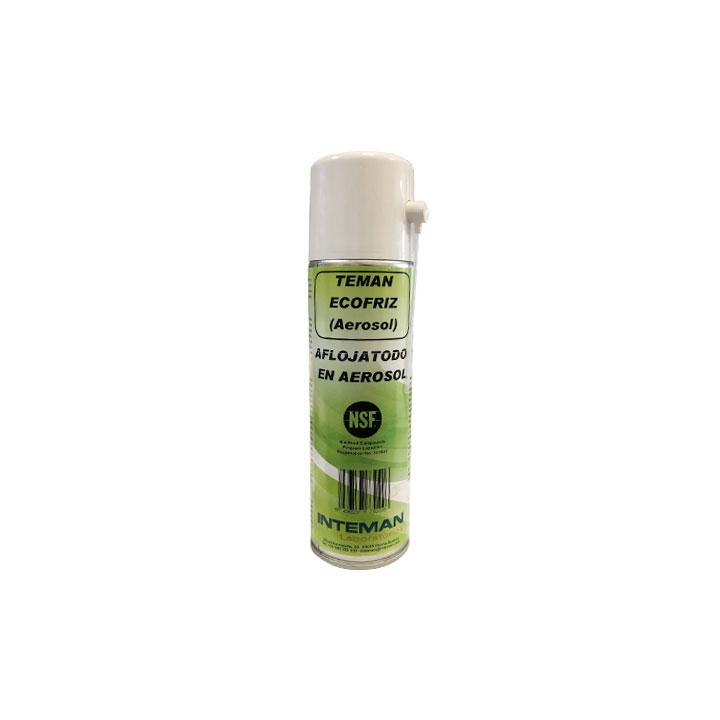 Aflojatodo aerosol Teman Ecofriz Inteman 500 ml, producto ecológico basado en aceites y aditivos vegetales de elevada acción lubricante y anticorrosiva que permite un efecto penetrante y desblocante de acción instantánea. Aplicaciones: producto de aplicaciones múltiples industriales, insustituible en labores de mantenimiento, para desblocar herramientas, tuercas, cables, frenos, grilletes, cerrojos, llaves, operaciones de bricolaje, automoción, etc… Inhibiendo la corrosión y lubricando los metales. Tratamientos antioxidantes y lubricantes.