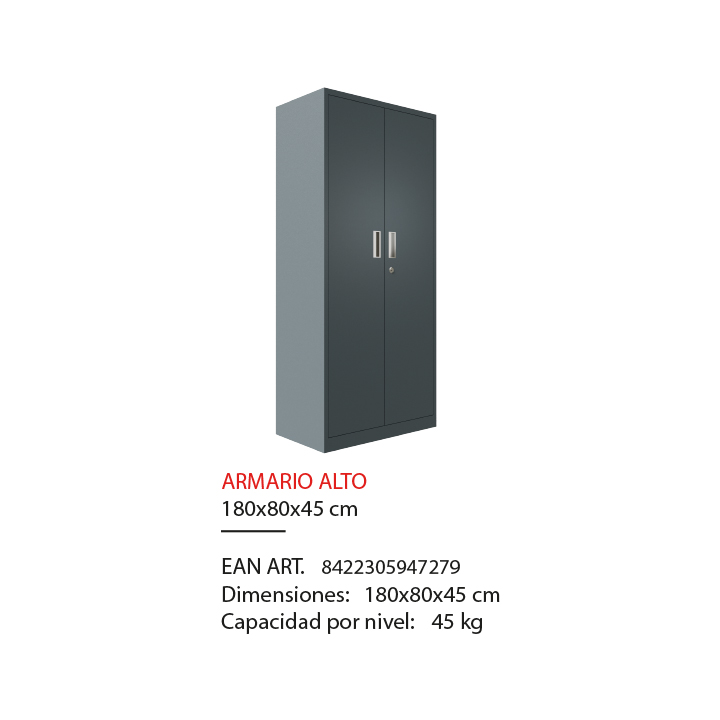 Armario alto Garage Series. Dimensiones: 180 x 80 x 45 cm. Capacidad por nivel: 45 Kg. EAN: 8422305947279.