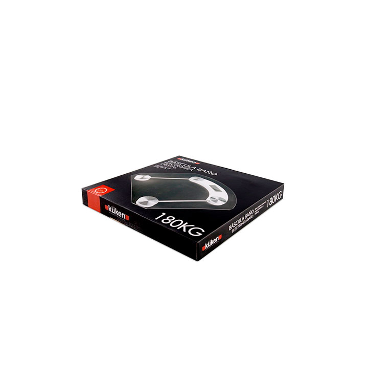 Báscula digital baño Kuken 33655, báscula digital de cristal para baño. Diseño fino de 35 mm de grosor. Base de cristal templado de alta resistencia. Conexión automática al subir a la báscula. Tamaño de la plataforma de 320 x 320 mm. Báscula digital de cristal y cuatro sensores de pesaje. Display de gran tamaño: 75 x 30 mm. Interruptor UNIT para escoger dentro de 2 unidades diferentes: Kg / lb. Peso máximo de180 Kg. Patas de goma antideslizante. Funciona con 1 pila 3V CR2032 (incluida). Dimensiones 320mm (largo), 320mm (ancho), 35mm (altura). Material Cristal templado. Patas antideslizantes Sí. Peso 2,0 kg. Funciona con 1 pila 3V CR2032 (incluida).