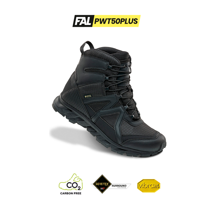 Bota Power Tech Range FAL PWT50Plus OB+SR+HRO+E+WPA+WR, bota de seguridad textil hidrofugado. Forro Gore-Tex con tecnología surround. Entresuela de phylon. Patín Vibram caucho. es una bota táctica de última generación, extremadamente ligera, completamente impermeable gracias al Gore-Tex Surround, y con un agarre superior gracias a su suela Vibram Megagrip, lo que la convierte en una opción premium para profesionales en movimiento que operan en diferentes climas y terrenos. Idónea para policías, cuerpos de seguridad, vigilancia privada y otros profesionales que requieren calzado táctico de alto rendimiento. Ref: 890203.