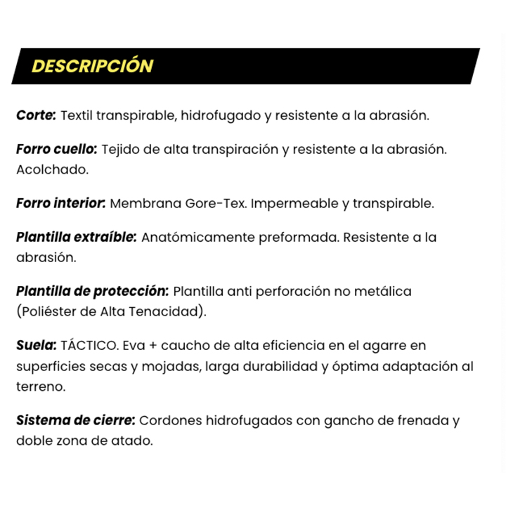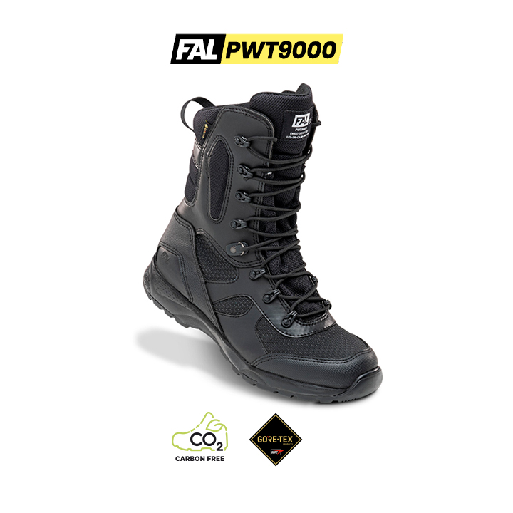 Bota Power Tech Range FAL PWT9000 O7S+SR+CI+HI+HRO+FO, bota de material textil hidrofugado resistente a la abrasión. Forro Gore-Tex. Plantilla antiperforación textil. Entresuela de goma EVA. Patín de caucho con nível de deslizamiento SR. Es una de las botas tácticas más robustas y con mayor nivel de protección de la línea Power Tech Range de FAL Seguridad. Combina la comodidad de una bota ligera y transpirable con protecciones esenciales contra la perforación y temperaturas extremas. Bota de caña alta, idónea para policías, cuerpos de seguridad, vigilancia privada y otros profesionales que requieren calzado táctico de alto rendimiento. Ref: 870203.
