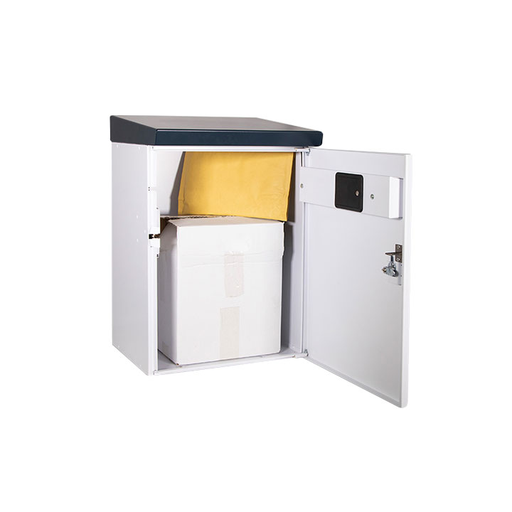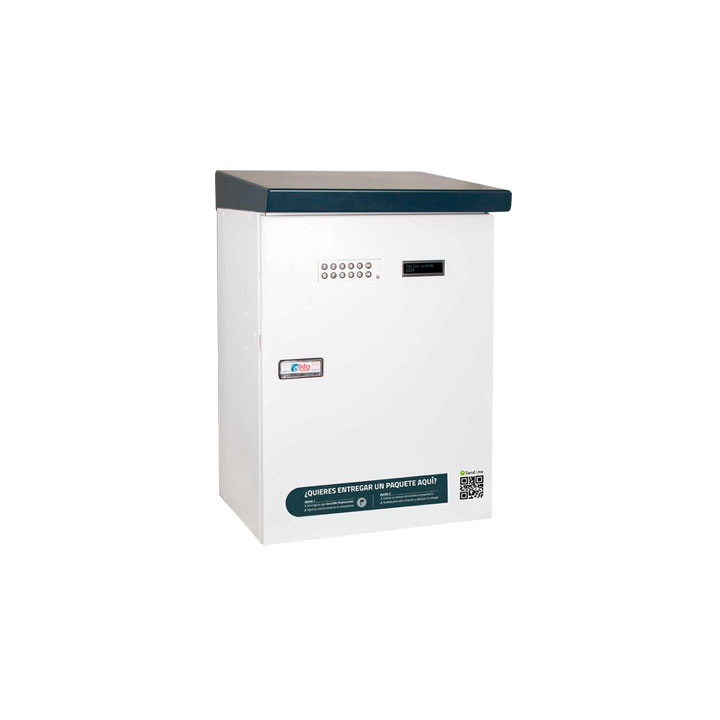 Buzón de paquetería iPackBox Standard blanco BTV,  el buzón Inteligente iPackBox Standard de BTV está diseñado para viviendas unifamiliares y tiene un solo compartimento para recibir paquetes. El cuerpo y el tejado están fabricados en acero galvanizado de gran resistencia. Útil en en domicilios donde se quiere conservar el buzón tradicional, o allí donde se requiera de un gran espacio de recepción. Con este buzón, el repartidor puede depositar los paquetes sin necesidad de que el propietario de la vivienda se encuentre en el domicilio. De esta manera, se evitan las las entregas fallidas por la ausencia del destinatario. Características; el cuerpo y el tejado están fabricados en acero galvanizado, tiene un solo compartimento para paquetes, funciona con 4 pilas AA incluidas, instalación fija en la pared, el color del tejado es azul grisáceo, se puede gestionar cómodamente a través de la aplicación send2me, dispone de una cerradura de llave para apertura de emergencia. En caso de que el repartidor no pueda abrir el buzón, puedes facilitarle un código de apertura que se genera desde la aplicación send2me. El repartidor introducirá este código a través del teclado numérico. Recibe tus compas online cuando no estás casas, Recibe notificaciones en tu Smartphone cuando el paquete esté listo para ser recogido. Medidas : ( base x altura x fondo en mm ): 387 x 570 x 300.