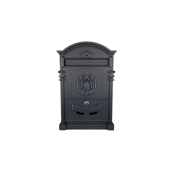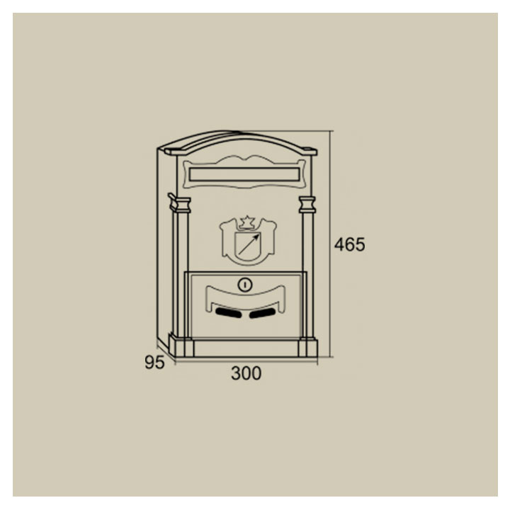 Buzón serie Alhambra BTV, buzón individual exterior, cuerpo de acero. Frontal de aluminio fundido. Elegante buzón de gran capacidad. Apertura de puerta hacia abajo. Cerradura redonda. Medidas : ( base x altura x fondo en mm ): 465 x 300 x 95. Boca ranura: 230 x 40 mm.
