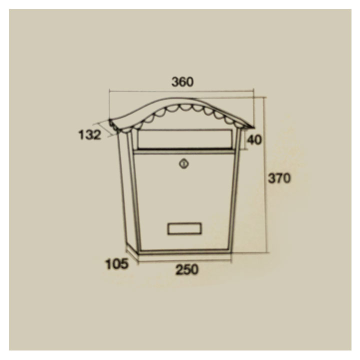 Buzón serie Cortijo color blanco BTV, construidos en acero pintado. Medidas : ( base x altura x fondo en mm ): 250 x 370 x 132. Boca ranura: 215 x 40 mm. Peso: 2´8  kg.