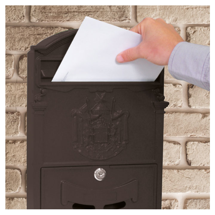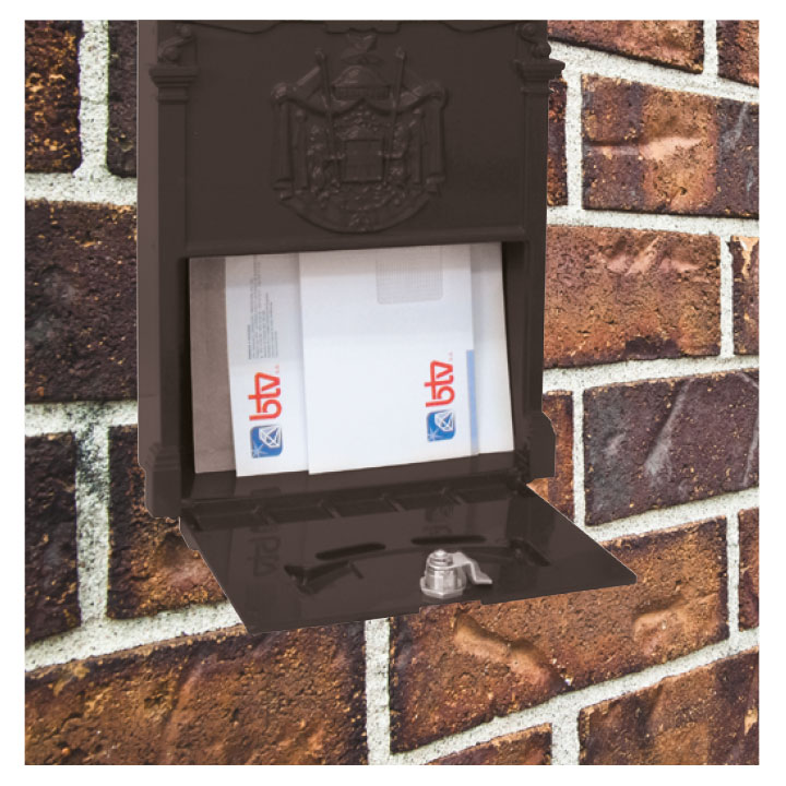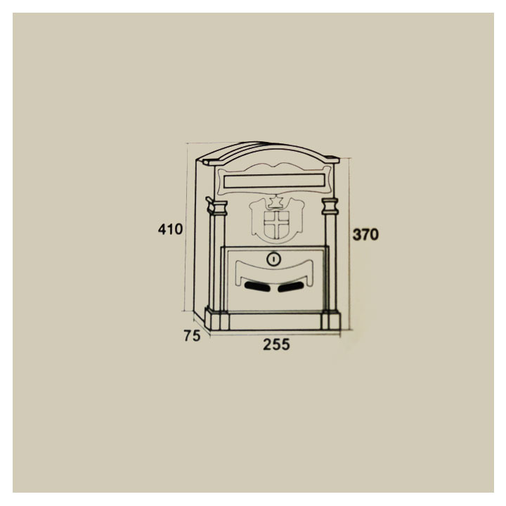 Buzón serie Imperial color negro BTV, frontal en aluminio fundido con cuerpo de acero. Con estilo neocásico, el Imperial es un buzón apuesto y ligero. Medidas : ( base x altura x fondo en mm ): 255 x 370 x 75. Boca ranura: 220 x 40 mm. Peso: 3  kg.