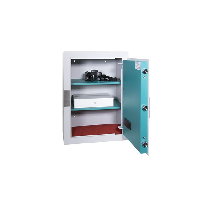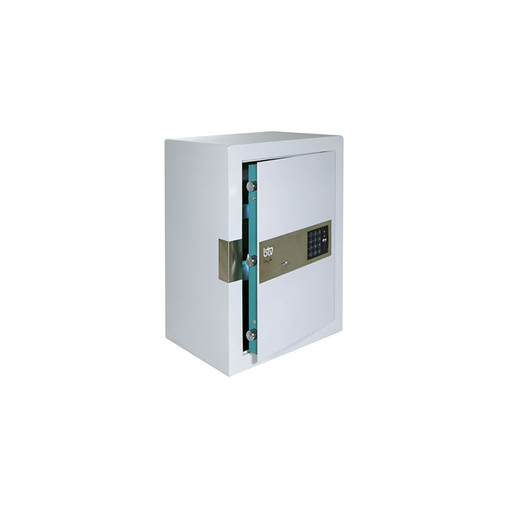 Caja fuerte serie Jade E-56 BTV, tres características definen a la serie Jade: seguridad, versatilidad y cuidado diseño. La gran variedad de tamaños y modelos en que se presenta, hace que estas cajas fuertes sean ideales tanto para entornos domésticos como de empresa. El color azul agua de su interior contrasta con el gris exterior en perfecta armonía, confiriéndole un aspecto muy estético. Espesor puerta: 6 mm. Espesor de cuerpo: 4 mm. Bulones: 2 a Ø 25 mm. Color: gris claro ( RAL 7047 ). Bandejas y tape azul agua ( RAL 5021 ). Dimensiones ranura: 150 x 12 mm.Orificios anclajes: 4 pared / 2 suelo Ø 9 mm. Iluminación interior: LEDs de bajo consumo. Sistema de cierre: cerradura de gorjas con llave de emergencia de seguridad. Cerradura electrónica con 1 código de uso de 2 a 15 dígitos. 1 código de emergencia de 8 dígitos Retardo programable de 1 a 99 minutos. Alimentación: 4 pilas AA de 1,5V incluidas. Aviso de pilas bajas. Toma de alimentación exterior con pila de 9V. Medidas: ( alto x ancho x fondo ) Exterior: 560 x 400 x 300 mm. Interior: 548 x 392 x 248 mm.