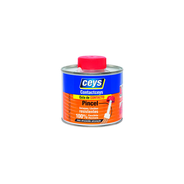 Cola de contacto Contactceys pincel 500 ml. Características: para uniones flexibles y resistentes. Incluye pincel para una fácil aplicación. Uso: Contactceys es una cola de contacto, en base neopreno, muy polivalente y de uso general para unir multitud de materiales. Materiales: cuero, madera, fórmica, goma, corcho, cartón, tejidos… entre sí o combinados con otros materiales. Aplicaciones; cuero, coma y caucho, Madera y laminados PVC, corcho, moquetas, láminas impermeabilizantes y coquillas. Formato: limpiar y secar las superficies. Aplicar una capa fina y uniforme. Dejar secar y unir ambas superficies.