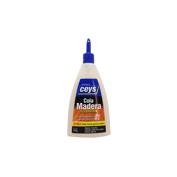 Cola para madera profesional Ceys 500 g, D2: alta resistencia,  D3: resistente a la humedad,  rápida, fija en 5 minutos. Interior y exterior. Pintable, Barnizable, Lijable, tintable. Temperatura de aplicación de +5ºC a +35ºC. Para trabajos de montaje y ensamblajes a tope o inglete, de caja y espiga, cola de milano, de horquilla, con clavijas y machihembrados. También revestimientos y trabajos de bricolaje y alistonado de parquet flotante.