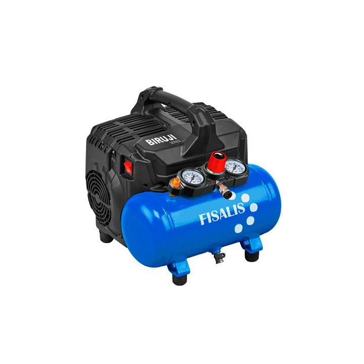 Compresor de pistón Biruji Fisalis, muy silencioso cuenta con alta protección gracias a su reforzada carcasa que protege todos los componentes internos. Estable y profesional, el compresor cuenta con panel de control con regulación y manómetros de muy sencilla lectura. De alta estabilidad con tacos de goma para mejor fijación. Presión máxima: 8 bar, presión de Servicio del compresor: 6 – 8 bar, caudal de aire aspirado: 105 l/min. potencia del motor eléctrico: 1 HP / 0,75 Kw, tensión-frecuencia-fases del motor: 230/50/1 , sistema de arranque del motor: directo, tipo de transmisión: directa, rosca del racor de salida: enchufe rápido con regulador de presión, número de cilindros:  etapas: 1 / 1 , revoluciones del cabezal: 1450 r.p.m. , límites de temperatura ambiente: 5º C / 45º C, nivel sonoro: 59 dB(A),  dimensiones (largo x ancho x alto): 380 x 380 x 385 mm,  peso: 16,5 Kg, capacidad del depósito: 6 l.
