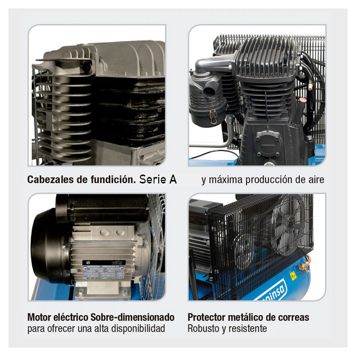 Compresor estacionario Imcoinsa 5/5 HP depósito 270 Lts 04A053, la gama de compresores ADVANCE esta diseñada para ofrecer una alta producción de aire con el máximo grado de disponibilidad. Cabezales y motorización sobre-dimensionada para ofrecer el máximo rendimiento en el sector industrial, automoción, agrícola, pintura, etc.. Modelo: 04A053. Motor 400V-T: 5/5 HP. Depósito: 270 litros. L.P.M: 670. Cabezal: B59. Peso: 155 kg. Medidas: 150x60x112 cm.