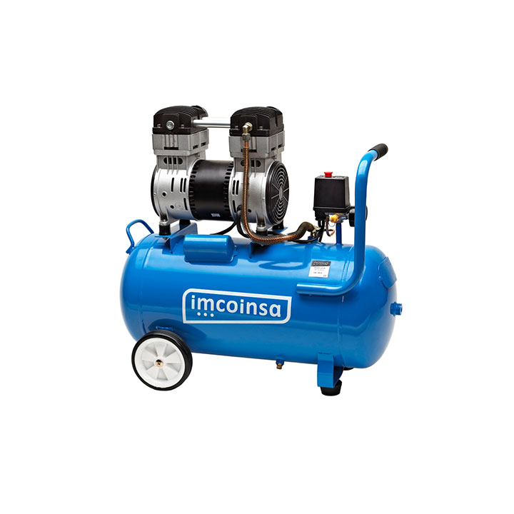 Compresor Silence-50 Imcoinsa 1 1/2 HP depósito 50 Lts 04650, de aire silencioso equipado con motor de inducción de bajas revoluciones (1.450 r.p.m.). Bajo nivel sonoro y mayor vida útil. Refrigeración sin aceite, facilitando las labores de transporte y libres de mantenimiento. Completa dotación compuesta de: Presostato y regulador de presión. Manómetro presión de salida. Manómetros presión del calderín. Ruedas de transporte. Enchufes rápidos universales. Modelo: SILENCE-50. Motor 230V: 1 1/2 HP. Depósito: 50 litros. Presión ATMS: 8. L.P.M: 205. Peso: 32 kg. Medidas: 73x37x69 cm.