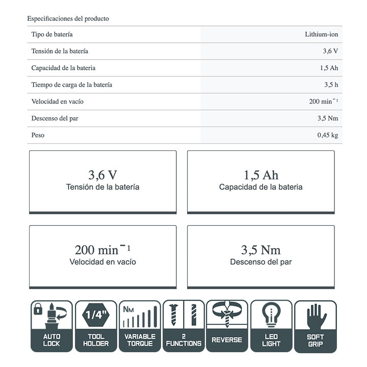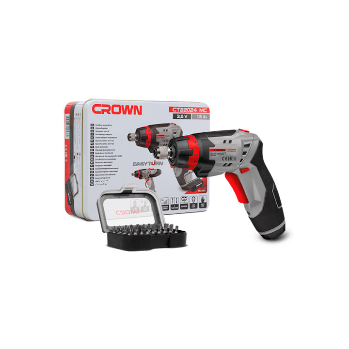 Destornillador inalámbrico Crown CT22024-MC 3,6V/1,5 Ah. Batería de litio 3,6 V – 1,5 Ah. Toque máximo: 3,5 Nm. 2 funciones – reversible. Mango giratorio, incluye set de 30 puntas.