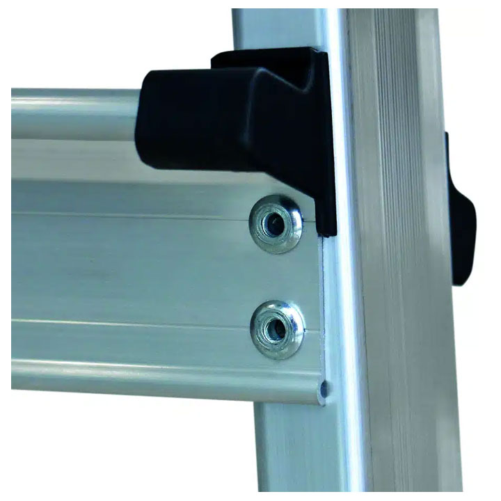 Los peldaños anchos de 10 cm brindan una plataforma estable y cómoda, permitiendo un uso prolongado sin fatiga. La plataforma antideslizante de polipropileno, con dimensiones de 25 x 28 cm, proporciona un agarre seguro. Además, las escaleras Deluxe cuentan con un gancho de seguridad que permite el cierre para su traslado, mejorando aún más la practicidad y la seguridad.
