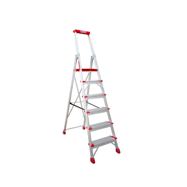 Escalera 6 peldaños de tijera Elegance EN946, está fabricada en aluminio con peldaños antideslizantes de 13 cm fijados con dos remaches de 5 mm que le otorgan gran resistencia. Además, posee un sistema de refuerzos en zonas vulnerables que dotan al modelo de una notable estabilidad y seguridad. Su tarima es de acero antideslizante de 27×27 cm y lleva una amplia bandeja portaobjetos. Este producto cumple con la normativa europea EN 131-1,2,3 y se entrega junto con el certificado de conformidad y el manual de instrucciones. La carga máxima que aguanta es de 150 kg.