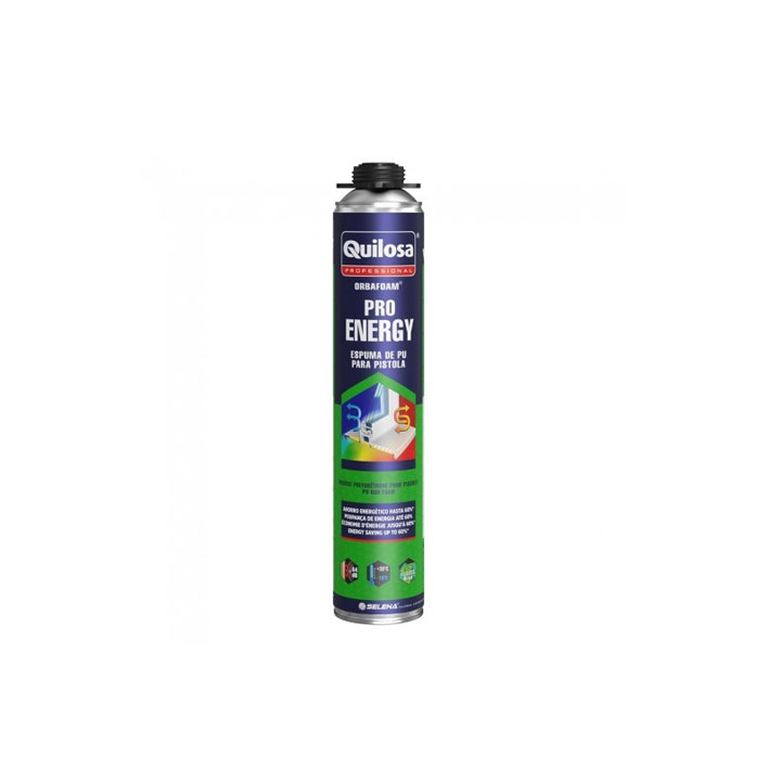Espuma de poliuretano para pistola Quilosa Orbafoam Pro Energy 750 ml, elimina los puentes térmicos de la forma más eficiente y permanente reduciendo la pérdida de energía hasta en un 60% en el aislamiento de la carpintería. Instalación profesional de ventanas y puertas donde se requiere los mejores valores de aislamiento térmico y acústico. Aplicación precisa gracias a su expansión controlada, economiza al máximo su rendimiento, evita las deformaciones en los marcos de puertas y ventanas.. Excelente aislamiento acústico 64dB.. Extraordinaria adhesión al PVC (+ 300%) Expansión controlada.. Celdas más compactas. Curado rápido: 25min. Indicada para uso invernal -10ºC a +35ºC. Conservación: 18 meses.