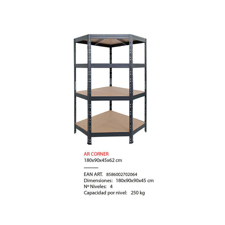 Estantería Garage Series Ar Corner. Dimensiones: 180 x 90 x 90 x 45 cm. Nº niveles: 4. Capacidad por nivel: 250 Kg. EAN: 8586002702064.