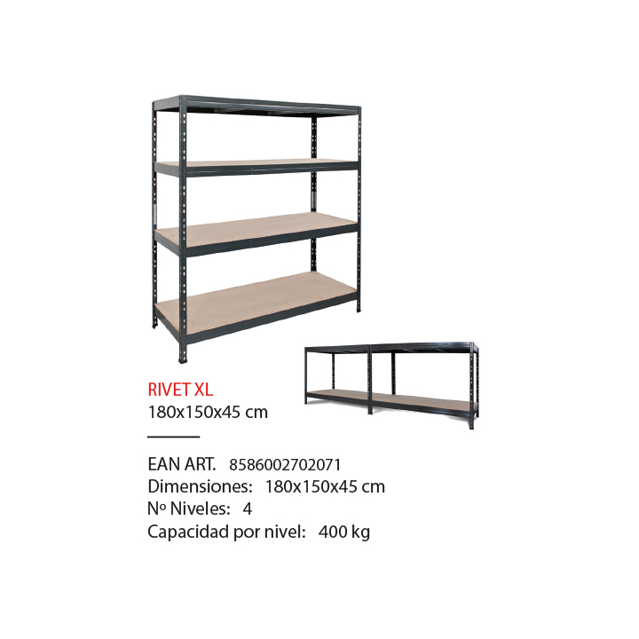 Estantería Garage Series Rivet XL. Dimensiones: 180 x 150 x 45 cm. Nº niveles: 4. Capacidad por nivel: 400 Kg. EAN: 8586002702071.