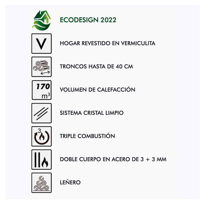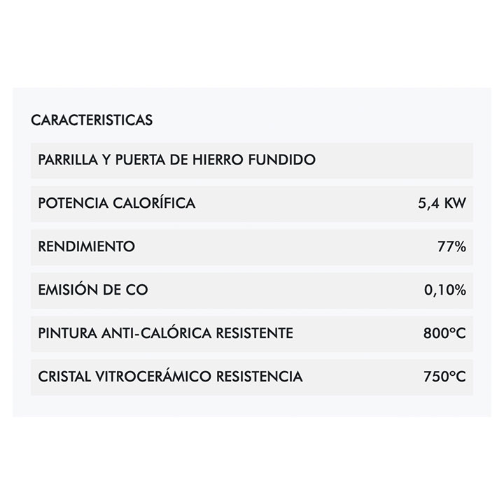 Estufa leña Ecodesign Coral 3V Panadero 18736, es una estufa de leña de increíbles prestaciones y con un diseño estético sublime que proporcionará un ambiente de confort a su hogar. Equípese para las bajas temperaturas del invierno con una estufa de leña, un aparato de combustión que calentará eficazmente su hogar. Un equipo de calefacción de gran versatilidad por su potencial calorífico, capaz de calentar estancias enteras, en caso de vivir en una vivienda de tamaño pequeño, o habitaciones en particular, si desea aumentar la temperatura de un lugar de la casa en concreto. Tiene un volumen de calefacción de 150 m³ y una potencia calorífica de 5,4 Kw. Puede utilizar la estufa a modo de sistema de calefacción principal, o como apoyo ocasional de su equipo calefactor principal. Su diseño clásico se compone por un doble cuerpo de acero formado por cámara de combustión y un leñero. Tiene unas medidas de ( alto x ancho x profundidad ) 73 x 44,6 x 38,4 cm, con la salida de humos situada en la parte superior de la cámara en posición vertical. Llama la atención su diseño de triple ventana que garantiza la máxima visión del interior de la cámara. Una estética excepcional que le permitirá contemplar el fuego en todo su esplendor y desde cualquier perspectiva y posición. Sentado, cómodamente, en el sofá o sillón de su salón, se dejará cautivar por la belleza del crepitar de las llamas y la calidez desprendida. Para regular la intensidad del fuego, encontrará un modulador de entrada de aire situado debajo de la puerta de hierro fundido. Un tiro de aire que permite graduar la cantidad de aire que penetra en el interior de la cámara. A más apertura de tiro, más cantidad de oxígeno en la cámara y, por tanto, más intensidad de llama. Para extinguir el fuego, cierre el tiro por completo y espere hasta la aparición de brasas antes de abrir la puerta y vaciar la cámara de cenizas. Incorpora un leñero en la zona baja de la estructura para almacenar sus leños de forma práctica y cómoda. Admite troncos de hasta 40 cm de longitud, con una capacidad de entre 10 y 12 leños.