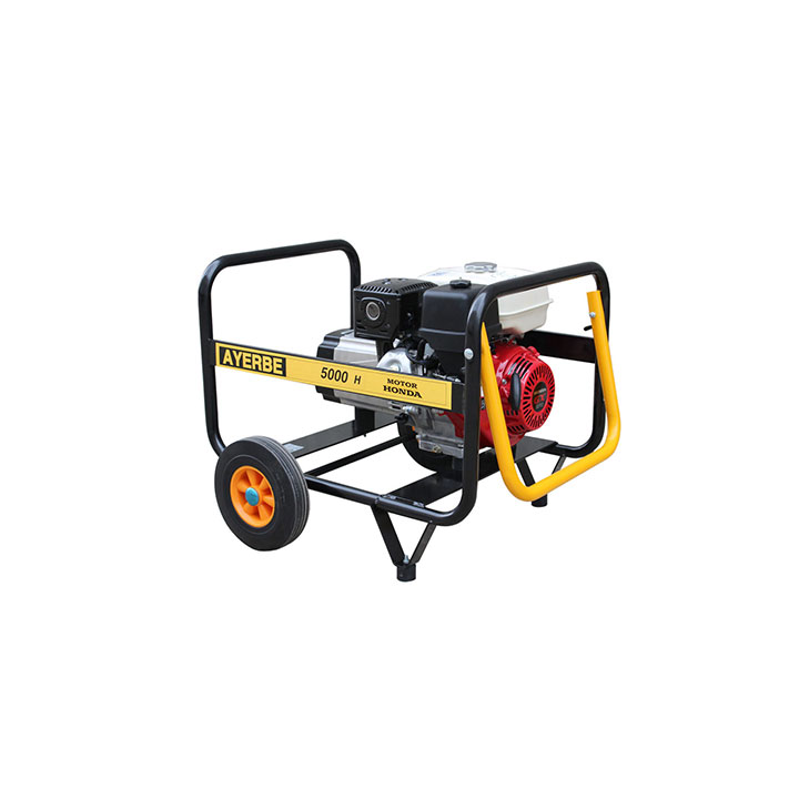 Generador gasolina Ayerbe 5000 H MN, generador gasolina, motor Honda GX-270272 cc 9 HP 4 tiempos. Alternador LINZ SP10 MF. Potencia máx. 5 KVA // 4200 W. Potencia nom. 5 KVA // 4200 W. Tension 5 KVA // 4200 W. Consumo 1,8 L/H (75%). Depósito: 6 L. Nivel sonoro 97 dB. Peso 63 kg. Arranque manual. Dimensiones 760 x 730 x 660 mm. Código: 5420040.