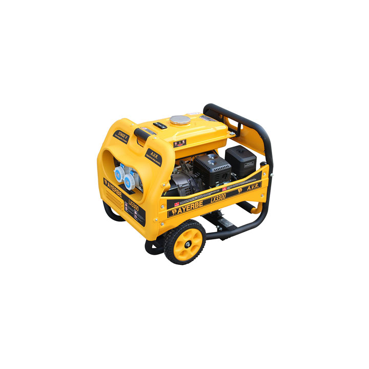 Generador gasolina Ayerbe LX3300 MN, generador gasolina, motor Kiotsu KT-175223 cc 7,5 HP 4 tiempos, Motor Stage V, homologación europea de emisiones. Gasolina OHV (válvulas en cabeza). Aternador salida regulada AVR. Potencia máx. 3300 W. Potencia nom. 3000 W. Tension 230 V. Consumo 1,2 L/H (75%). Autonomía: 9 horas. Depósito: 10 L. Nivel sonoro 95 LwA / 72 LpA@7m. Peso 58 kg. Arranque manual. Dimensiones  660 x 470 x 560 mm. Cuadro de mandos: disyuntor, protege las sobrecargas, alarma de aceite, cuenta horas, diferencial y pica de tierra, voltímetro digital, frecuencímetro digital, tomas IP67. Chasis tubular reforzado, protecciones delanteras y laterales. Asa manillar abatible. Ergonómico, fácil movilidad. Ruedas impinchables 200 mm. Código: 5433010.
