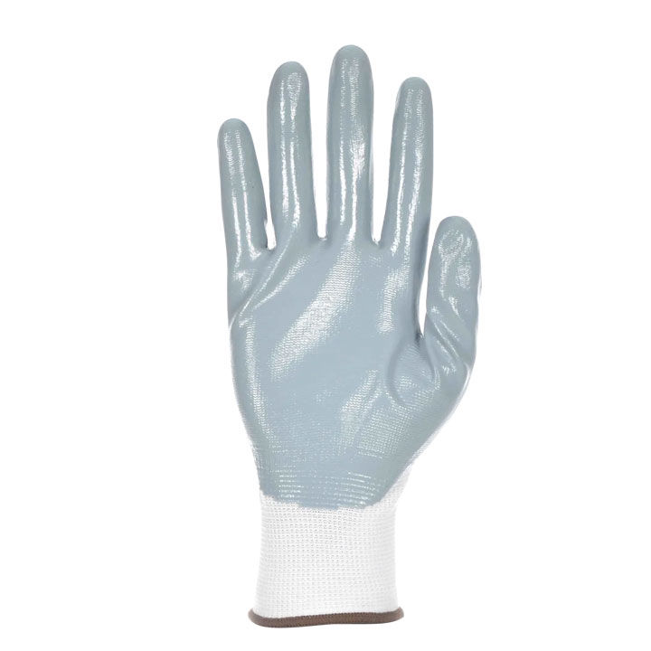 Guante soporte poliéster blanco sin costuras, recubrimiento nitrilo gris en palma. Puño elástico, galga 13.
