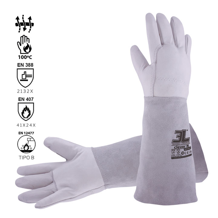 Guante en piel flor vacuno en color blanco/gris con grueso de 0,7 mm. a 0,8 mm. y manga de serraje de 180 mm de longitud. Elástico en el dorso, forrado interior con tejido afelpado en la parte de la mano, y buena resistencia a la abrasión. Alta dexteridad. La longitud total del guante es 420 mm.