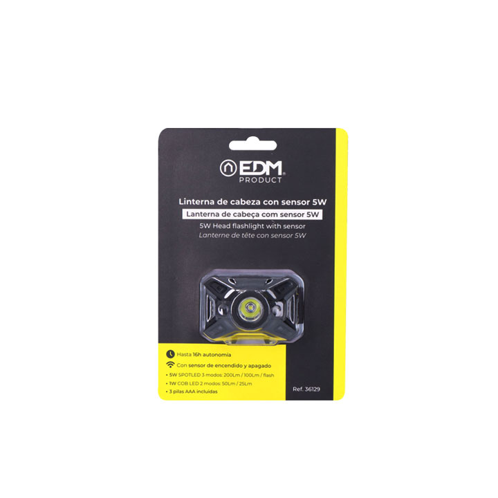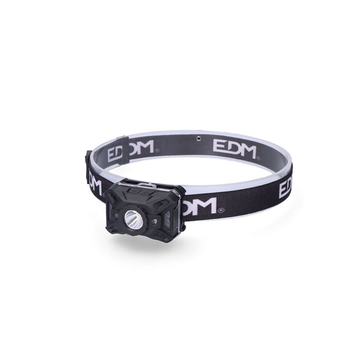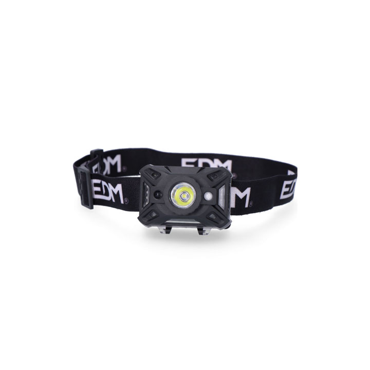Linterna frontal EDM con sensor encendido/apagado 1 led cob 5W 7 tipos de luz ( 3 pilas AAA incluidas ), 1 led cob 5W + 1W 7 tipos de luz. 7 funciones: luz led blanca máxima intensidad, luz led blanca menos intensidas, flash, luz inferior máxima intensidad, luz frontal roja, luz frontal roja flash. Funciona con 3 pilasAAA ( ya incluidas ). Autonomía aproximada. 16 horas. Inclinación ajustable. IP20. Ref: 36129.