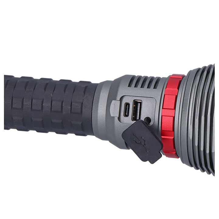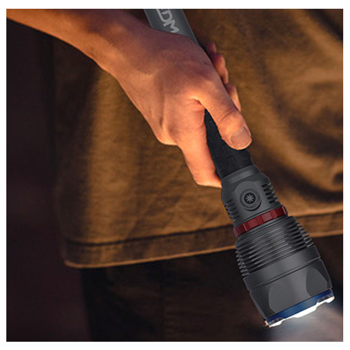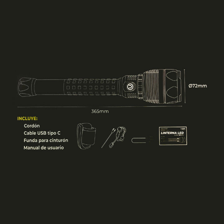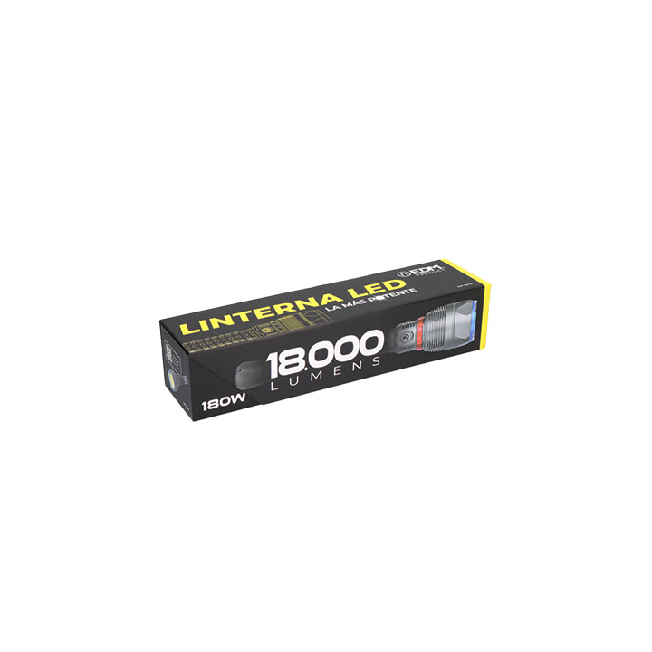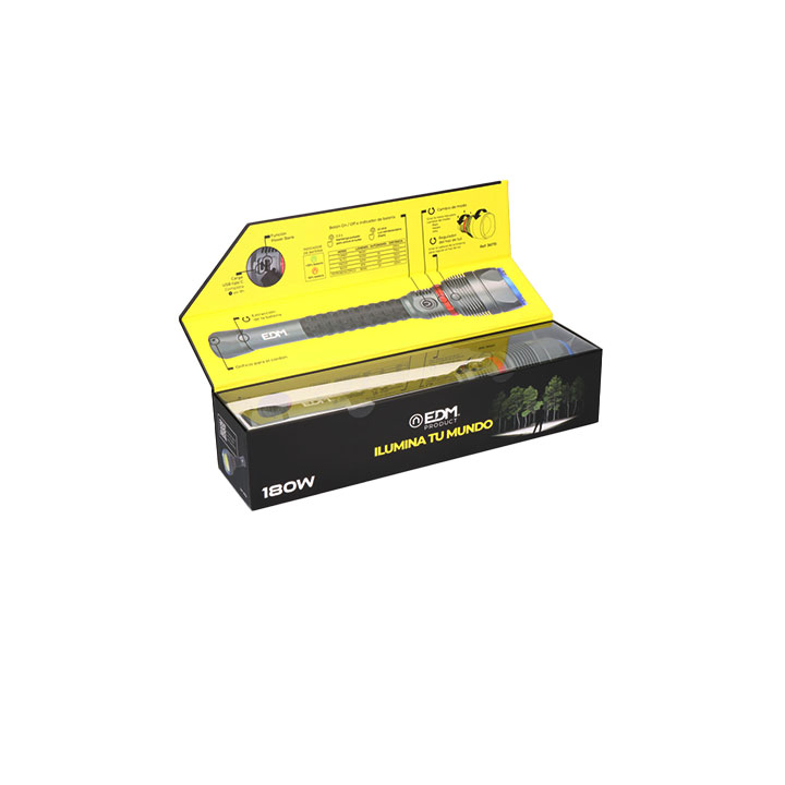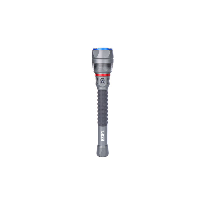 Linterna LED EDM 18.000 lumens 36170, hasta 20 horas de autonomía. Características: 180W lLED 6500K 5 Modos: Turbo (30s) 18000Lm/10000Lm/5000Lm/800Lm/ Luz estroboscópia (flash). Hasta 20 horas de autonomía con función de Power Bank, impermeable IP67. Batería:  3×5000 mAh de litio incluida, material de  aluminio, carga en 9 horas, con indicador de batería. Incluye: cordón, cable USB tipo C, funda para cinturón y manual de usuario.