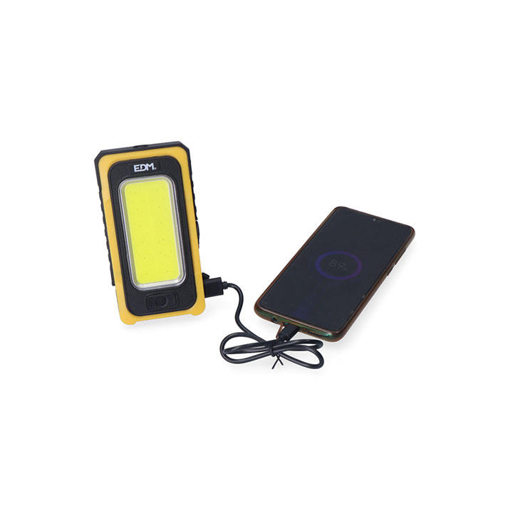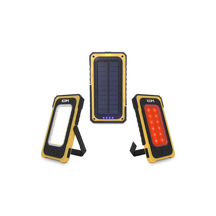 Linterna Led solar recargable EDM con gancho e imán cob 10W 750lm, incluye una luz superior frontal de 3W 70lm, batería de 4000mAh de litio. Función PowerBank. Tiempo de carga con cable USB 5-6h. Diseño ultrafino. 3 intensidades de luz; blanca lumens : 250-450-750. 2 intensidades de luz roja. Fija + flash. Indicador luminoso de carga. Incluye cable de carga. IP20. Carga función solar: Ideal para situaciones de emergencia, carga aproximada de 12 horas= 20% carga batería aproximada. Autonomía aproximada de 6 a 8 horas. Ref: 36126