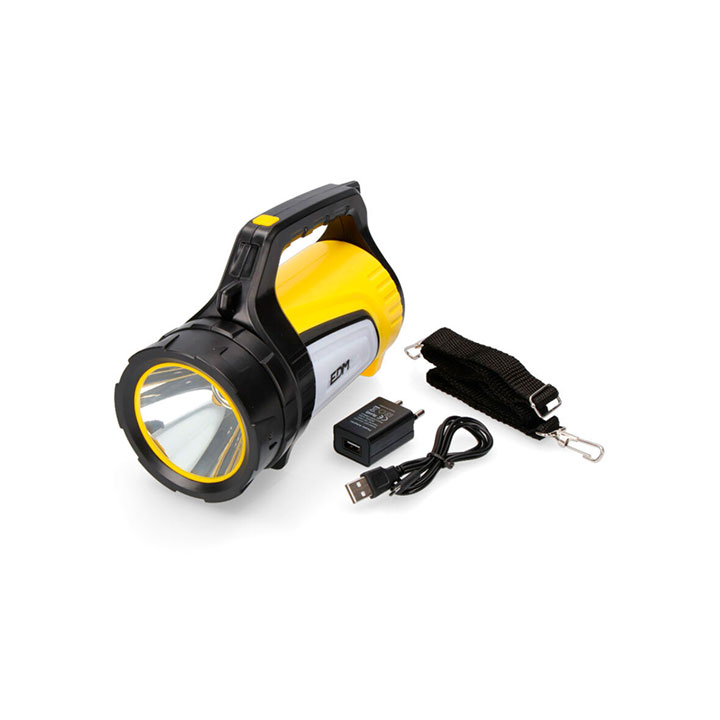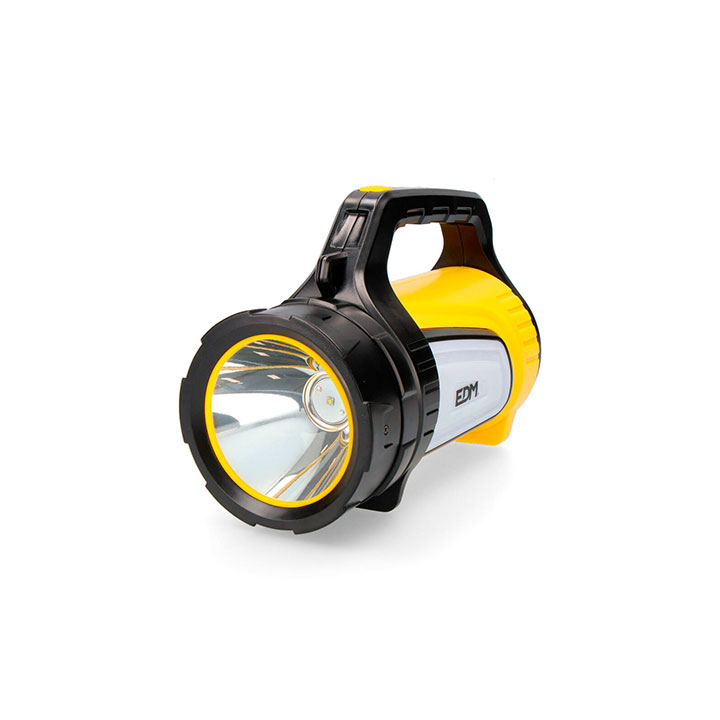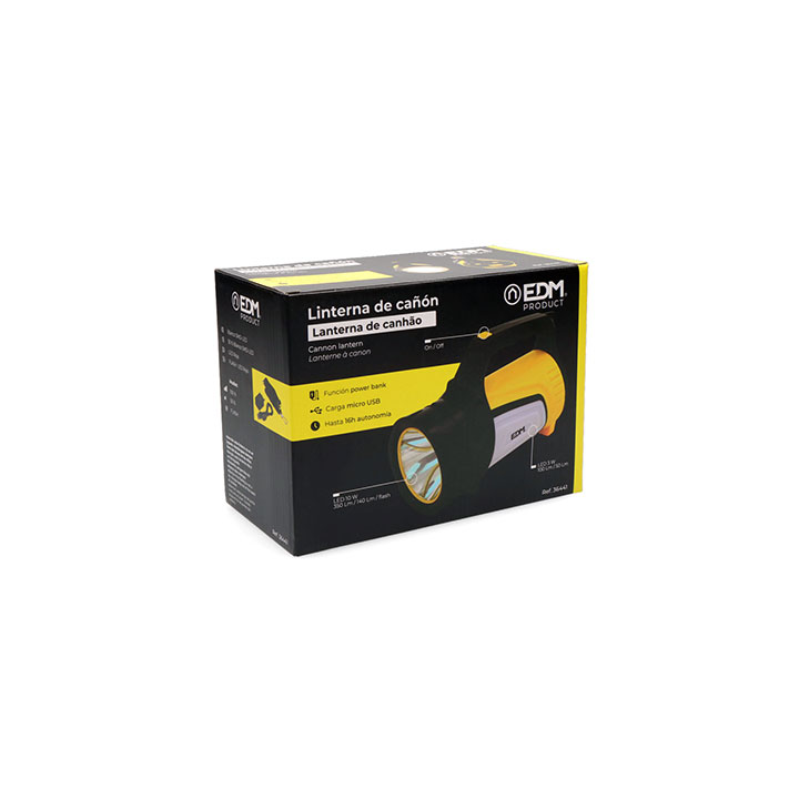 Linterna multifunción EDM largo alcance, luz principal 10W + lateral 3W y Power bank 350lm, portátil luz principal 10W 350/140lm/flash. Luz lateral blanca-roja 3W 100/50lm. Led de punto 6000K. Led SMD 7500K. Función Power Bank. Luz lectura de mapas. 4000 mAh duración hasta 16 horas. Indicador luminoso de carga. Medida: Ø10x20x15cm (diámetro/fondo/alto). Incluye cinta bandolera y cargador. Aplicación: Profesional / Doméstica. IP20. Ref: 36441