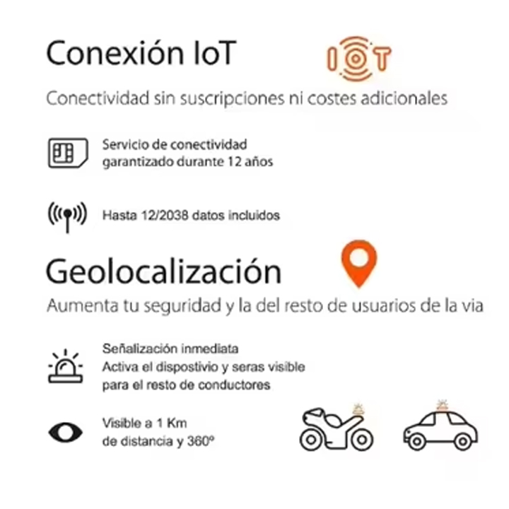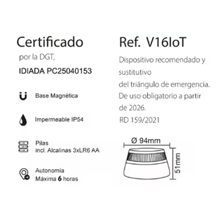 Luz baliza de emergencia geolocalizada EBOX V16loT EB2503 + funda antigolpes. Homologada por la DGT. Certificación IDIADA PC25040153. Visible a 1 km de distancia y 360º. Geolocalizada. Permite aumentar tu seguiridad y la del resto de usuarios de la vía. Base magnética. Impermeable IP54. Conexión IoT. Autonomía máxima de 6 horas. Conectividad sin suscripciones ni costes adicionales. Servicio de conectividad garantizado durante 12 años. Hasta 12/2028 datos incluidos. Dispositivo recomendado y sustitutivo de triángulo de emergencia – De uso obligatorio a partir de 2026. Medidas: 94 x 51 mm. Pilas alcalinas incluidas (3*LR6 AA). Conectividad sin suscripciones ni costes adicionales.