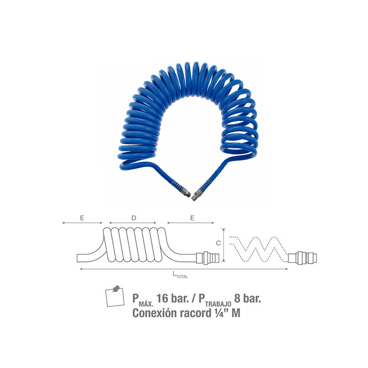 Manguera espiral de poliuretano Imcoinsa 0U065, manguera espiral de poliuretano ( PU fabricación BASF ) de alta resilencia, durabilidad y resistencia al frío. Aplicaciones en la industria de automoción, aeroespacial, pintura, instalaciones neumáticas, etc… P máx 16 bar / P trabajo 8 bar. Conexión racord 1/4″ M.