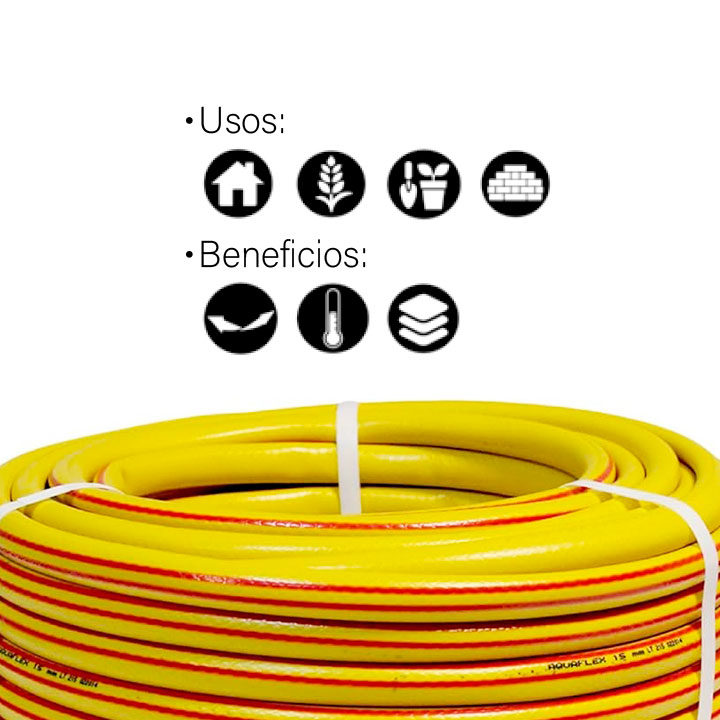 Manguera PVC flexible Aquaflex rollo 50 metros ( medida: 25 mm ), manguera económica en PVC flexible. Compuesta por 3 capas. Una de ellas es un en hilo poliéster. Utilizada para jardines, agricultura y construcción. Temperatura mínima -10ºC y temperatura máxima +55ºC. Medida: 25 mm. Presión: 8 bares. Libre de cadmio y plomo.