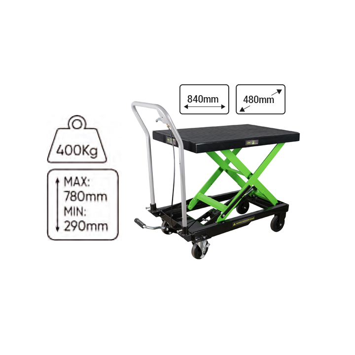 Mesa hidráulica JBM 400Kg 50630. Capacidad: 400Kg. Altura mínima: 290mm. Altura máxima: 780mm. Peso: 63Kg. Dimensiones ( largo x ancho x alto ): 840x480x780mm. Ref: 50630.