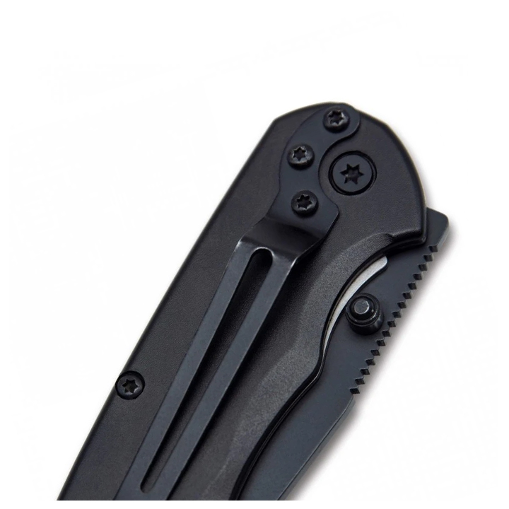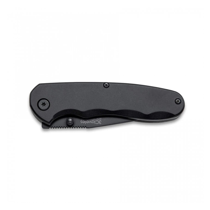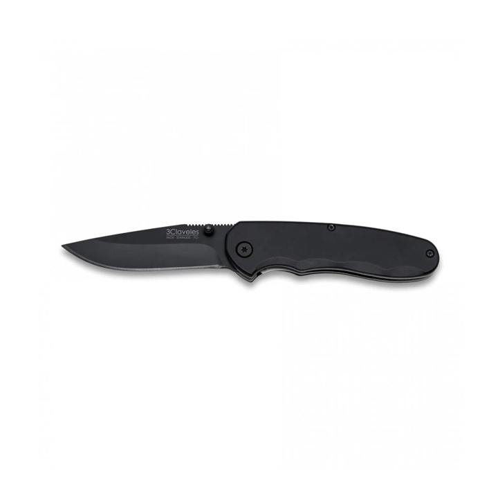 Navaja Dark 3 Claveles, de acero inox 7Cr. Pavonado negro. Mango Aluminio. Anodizado negro. Hoja 77 x 21 x 2,8 mm. Mango 100 mm. En acero inoxidable y mango en aluminio anodizado negro. La hoja mide 77x21x2,8 mm y el mango 100 mm. Incorpora clip para el cinturón desmontable. Bloqueo en el cuerpo. Apertura una mano. Textura apoyo pulgar. Ref: 03808.
