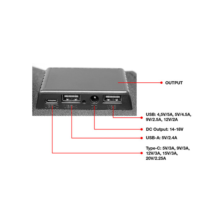 Panel solar plegable 60W. Dimensiones: 1255 x 357 x 20mm. Potencia: 60W.