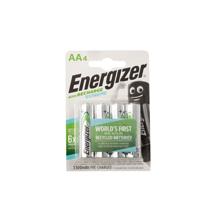 Pilas recargables Energizer AA4 HR6 2300 mAh ( 4 unidades ), las pilas recargables Energizer Extreme AA de larga duración son ideales para alimentar las cámaras digitales, dispositivos GPD y sistemas de juegos inalámbricos de forma eficaz y respetuosa con el medioambiente.