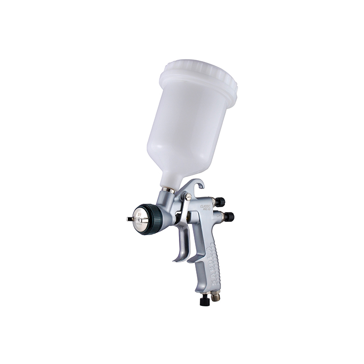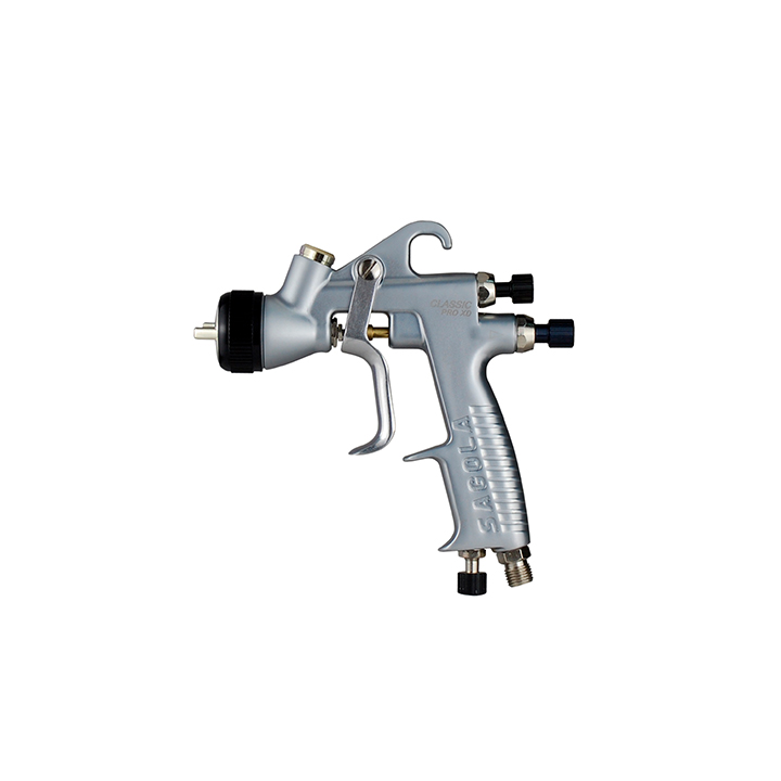 Pistola aerográfica de gravedad Sagola Classic Pro XD, con un nuevo cuerpo con una mejorada ergonomía, la más amplia gama de respuestas y soluciones de aplicación y el cumplimiento estricto de las normativas más exigentes de fabricación y emisiones de disolvente, distinguen al nuevo modelo Classic Pro XD. Nuevos cabezales. Perfecta calidad de pulverización Sagola. Máxima transferencia de pintura. La mejor relación calidad/precio en pistolas para primer convencionales. Industria: Acabados de alta calidad e imprimaciones. Madera: Lacas, Barnices, Fondos, Barnices al agua,… Decoración: Esmaltes y Barnices. Nuevo diseño del cuerpo. Máxima ergonomía y comodidad. Sin juntas entre el aire y la pintura. Distribuidor de aire interno evita piezas sueltas y deterioros. Picos y agujas en Acero inoxidable. Economía de tiempos. Cromado Mate. Mayor imagen de calidad y facilidad de limpieza. Cumplimiento de las normativas más exigentes sobre emisión de disolventes. Posibilidad de trabajar con compresores portátiles > 2HP. Boquillas de bajo consumo. Versión HVLP – Máximo ahorro y mínima niebla. Versión EPA – Alto rendimiento en acabados. Peso sin depósito: 480,8 g. Peso con depósito: 665 g. Dimensiones con depósito: 17,7 x 10,5 x 33,3 cm. Dimensiones sin depósito: 17,9 x 1,9 x 17,7 cm. Racor de entrada de aire: BSP 1/4″ M. Presión máxima de diseño: 8 bar. Presión máxima de entrada recomendada (presión de trabajo): 2 bar. Distancia de aplicación máxima recomendada HVLP: 12 -15 cm. Distancia de aplicación máxima recomendada 21 EPA y 25/36/28: 18-20 cm. Consumo de aire Boquilla 21 EPA: 225 L/min. Consumo de aire Boquilla HVLP: 355 L/min.