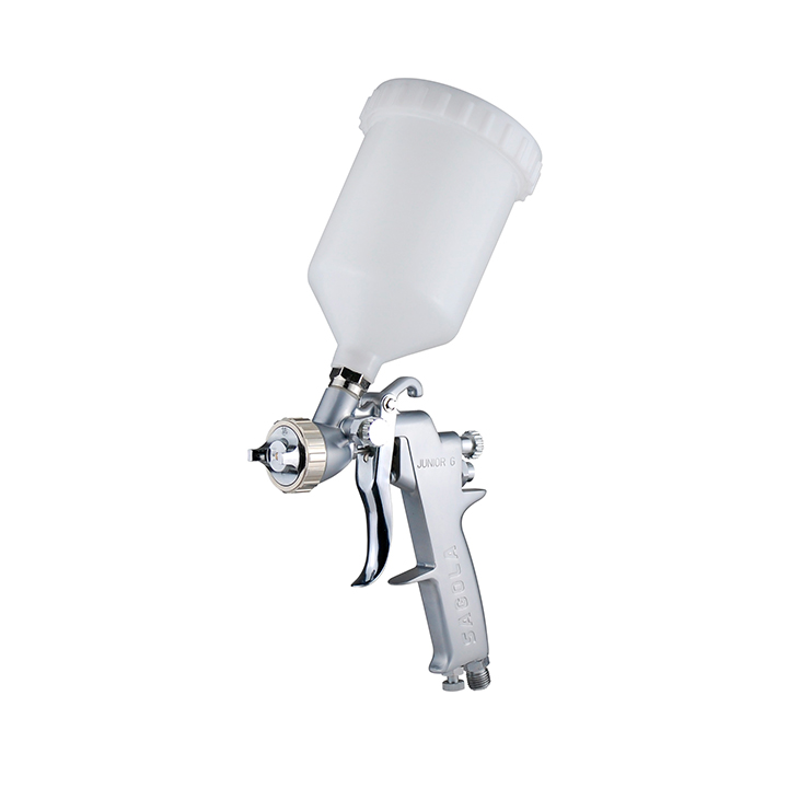 Pistola aerográfica de gravedad Sagola Junior G, es una pistola de gravedad muy económica en contraposición a sus prestaciones. Pistola con un cuerpo robusto, de diseño exclusivo de SAGOLA. Es ligera y tiene un diseño ergonómico. Es una pistola adecuada para trabajar con compresores de 1,5 HP de potencia. Muy bajo consumo de aire. Incorpora regulador de caudal de aire, de producto y de abanico. Depósito de 600 ml. de capacidad. Incluye conector rápido. Peso con depósito: 493 gr. Peso sin depósito: 371 gr. Dimensiones con depósito: 17 x 10 x 32 cm. Dimensiones sin depósito: 14,5 x 5,4 x 17 cm. Conexión entrada de aire: BSP 1/4″ M. Consumo de aire: 115 – 125 L/min. Presión máxima de entrada recomendada (presión de trabajo): 2 bar. Tamaño de abanico: 230 – 265 mm. Capacidad del depósito: 600 ml.