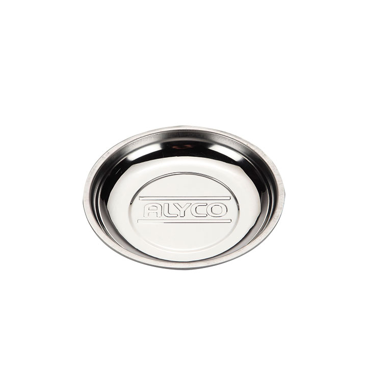 Plato magnético Alyco 121500, de diámetro 150 mm y 6″. Soporte de Acero inoxidable magnético con posibilidad de mantener en sobremesa, o también en superficies de soportes metálicos (carros, mesas de trabajo, etc.) para mantener pegados objetos metálicos (tornillos, pernos, tuercas, etc). Consta de una superficie en Acero Inoxidable con profundidad de 25 mm., 1 potente imán adherido al fondo con potencia de 1000 Gauss, y base de PVC para proteger las superficies y evitar rayados. Fabricado en Acero Inoxidable, lo que le da larga vida útil. Potente imán con 1000 gauss de capacidad lo que permite fijar incluso piezas metálicas grandes sin peligro de desprenderse. El imán permite la fjación del plato a multiples superficies metálicas, como carros, mesas de trabajo, etc. tanto en posición horizontal (sobremesa), como vertical (pared vertical de un carro). El fondo es de PVC lo que protege la superficie de pegado de rayas. Muy apto en industria, mecánica de automóvil, etc…  Ref: 121500.
