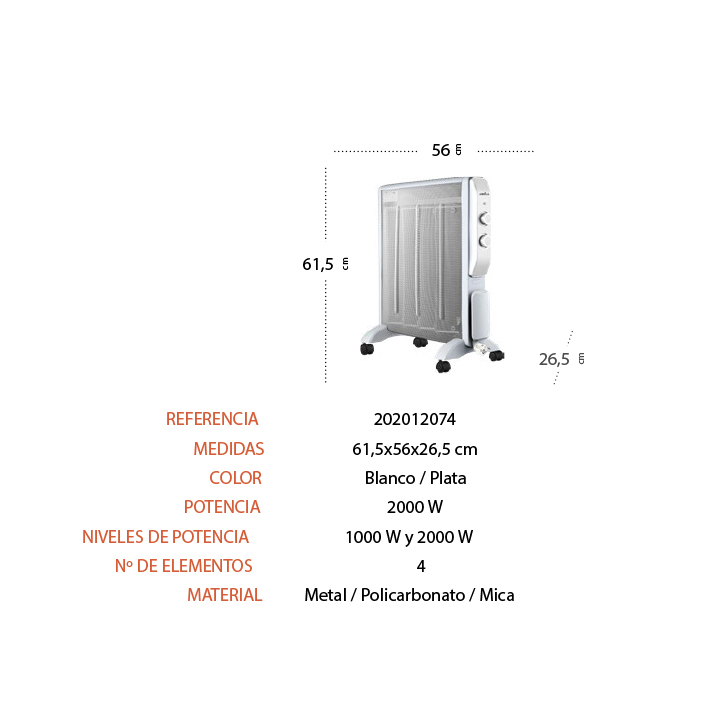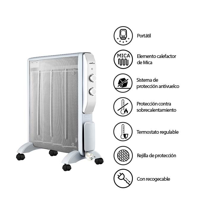 Radiador de mica Abrigo 2000W blanco/plata. Material: metal/policarbonato/mica. Uso:  Recomendado para interiores. Ahorro de energía. Uso doméstico. Certificado CE. Certificado Reciclaje. Con ruedas. Dimensiones (alto x ancho x fondo): 61,5X56X26,5 cm. Voltaje: 220-240 V. Con rejilla de protección calefacción. Potencia Máxima:2000W. Con sistema de protección antivuelco. Termostato Regulable. Piloto Luminoso. Con recogecable. Fijación portátil. Niveles de potencia: 1000W y 2000W. Con protección contra sobrecalentamiento. 4 elementos. Elemento calefactor de mica.