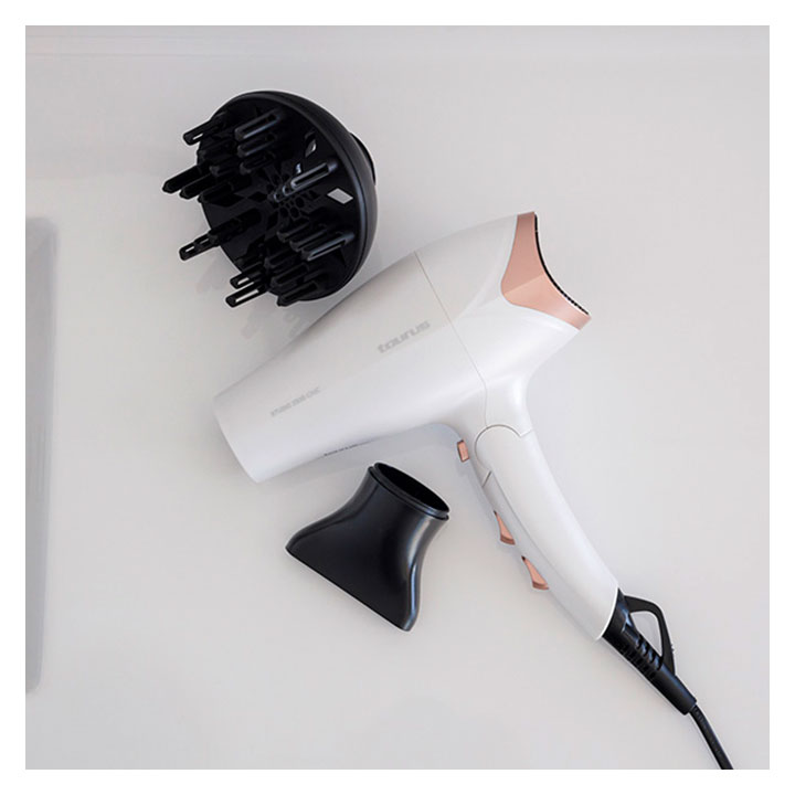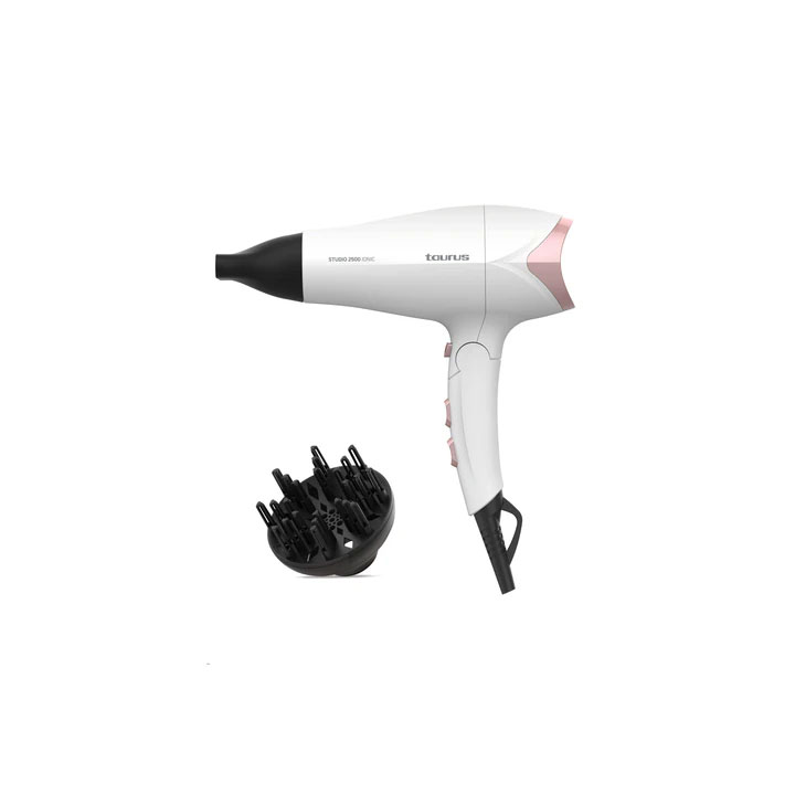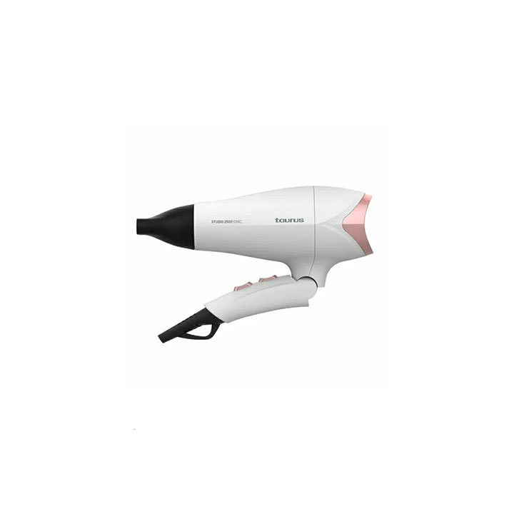 Secador iónico plegable Taurus Studio 2500, El secador de pelo Taurus Studio 2500 Ionic es un modelo muy potente, que puede trabajar hasta con 2400 vatios. Destaca por su elevada funcionalidad, ya que permite elegir entre tres temperaturas, lo que facilita la adaptación a todas las tipologías del cabello. Tiene dos velocidades para tener la oportunidad de escoger la que mejor se adapte a las necesidades del momento. Gracias a su potencia de hasta 2400 W, podrás conseguir un secado de pelo mucho más rápido. Despídete de la estática y del encrespamiento Con este modelo podrás superar esta situación gracias a su secado ionizado. Podrás limpiar este modelo con gran facilidad, ya que su filtro es muy fácil de extraer. ¿Vas de viaje? No importa, podrás llevar contigo este secador a cualquier destino, ya que pesa muy poco y cabe en cualquier maleta de tamaño corriente. Lo mismo ocurre con el cable de alimentación y los difusores que van con el secador, que podrás llevar incluso al gimnasio. Regula la temperatura, Impide el exceso de calor en tu cuero cabelludo, al incorporar un botón con el que puedes activar un chorro de aire frío de varios segundos de duración. Puedes activarlo varias veces seguidas, con la ayuda del ajuste que hay debajo del filtro extraíble de secado. Especificaciones: 2400W máx. Tecnología iónica. 2 velocidades. 3 temperaturas. Golpe de aire frío. Mango plegable. Fácil transporte y almacenamiento.  Filtro extraíble. Anilla para colgar.
