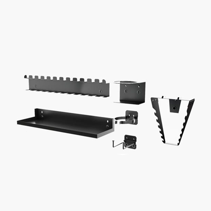 Set de accesorios en kit Pro Series. Componentes: 2 sujeta ltas. 1 bandeja. 1 organizador herramientas. 1 estante destornilladores. 6 ganchos dobles. 4 clips portaherramientas.
