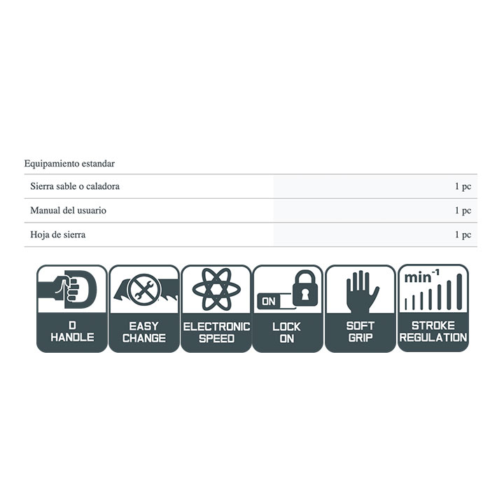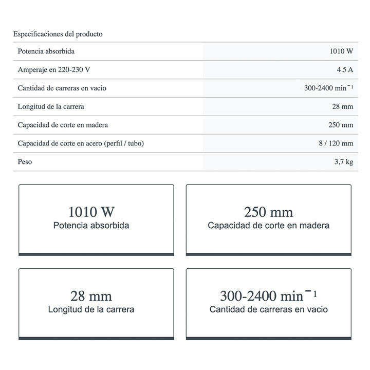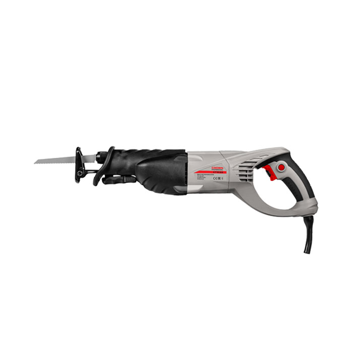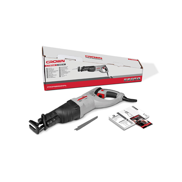 Sierra de sable Crown CT15133, cuchilla de cambio rápido y regulación de velocidad de corte. Potencia absorbida: 1010 w. Amperaje en 220-230 V: 4.5 A. Cantidad de carreras en vacío: 300-2400 minˉ¹. Longitud de la carrera. 28 mm. Capacidad de corte en madera. 250 mm. Capacidad de corte en acero (perfil / tubo): 8 / 120 mm. Peso: 3,7 kg.