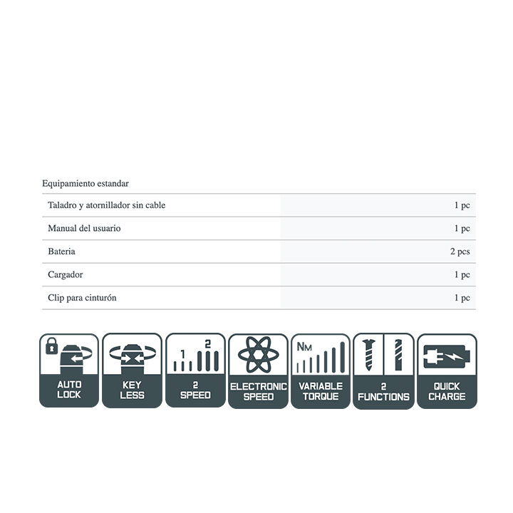 - Portabrocas hexagonal de ¼″ para un cambio de accesorio rápido y sencillo