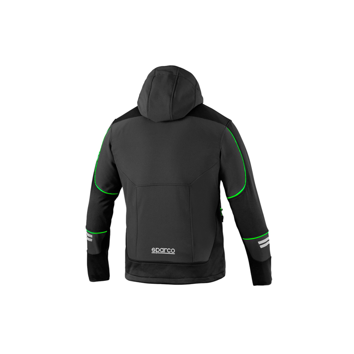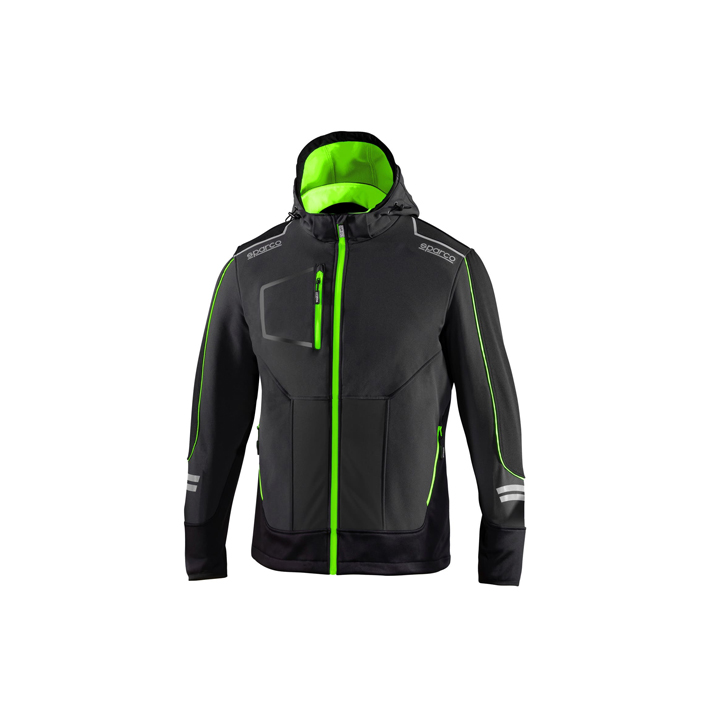 Tech Soft-Shell York Sparco Gray-Green, softshell técnico. Peso: 330 gr/m². Composición: Exterior 93% poliéster, 7% spandex Interior 100% poliéster (forro polar). Especificaciones: Inserciones con refuerzos en hombros y mangas en material antiabrasión. Tiras reflectantes de alta visibilidad en las mangas. Capucha con doble ajuste; desmontable y plegable. Puños y bajos elásticos. Cumple con EN ISO 13688:2022 – CAT.1.