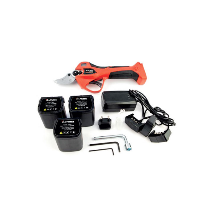 Tijera de poda eléctrica Altuna AB37, a batería. Posibilidad de elegir la apertura de tus tijeras de podar para realizar corte desde 23mm a 37mm, también puedes elegir entre un corte progresivo o un pulso. Mejora la productividad en viñedos y frutales. Corte 25 – 37mm. Corte progresivo. Fácil conexión. Sistema anticorte. Incluye: Tijera inalámbrica AB37, maletín negro de foam, 3 baterías de litio de 21,6V, cargador con conexion triple,  adaptadores tomo eléctrica, dispensador con aceite y guia de uso y mantenimiento.