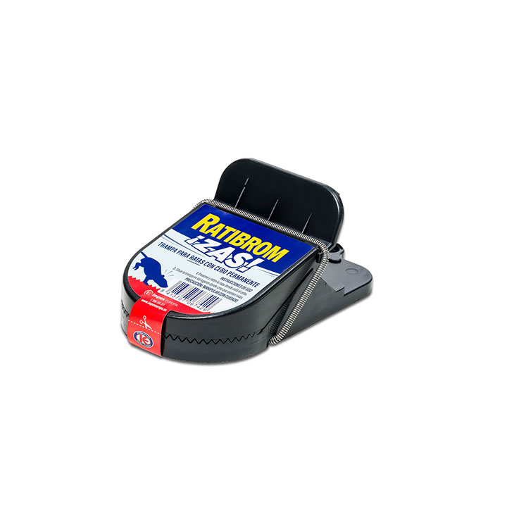 Trampa para ratas grande Ratibrom Zas con cebo permanente, que incluyen un cebo permanente para atraer a ratas y ratones de gran tamaño. No contiene veneno. Manipular con precaución. Trampa pinza de tamaño grande que favorece la captura de ratas y grandes roedores en zonas interiores como exteriores. Medidas: 19,5 cm largo x 9,4 cm ancho.