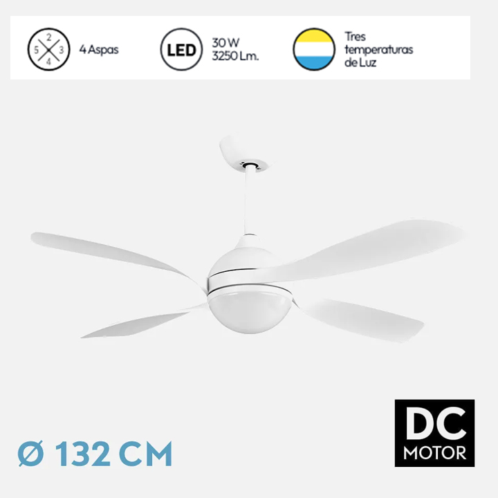 Ventilador de techo DC LIVORNO blanco 30w 3250lm 132d 4aspas 3000k,4500k,6000k, control remoto, temporizador, memoria