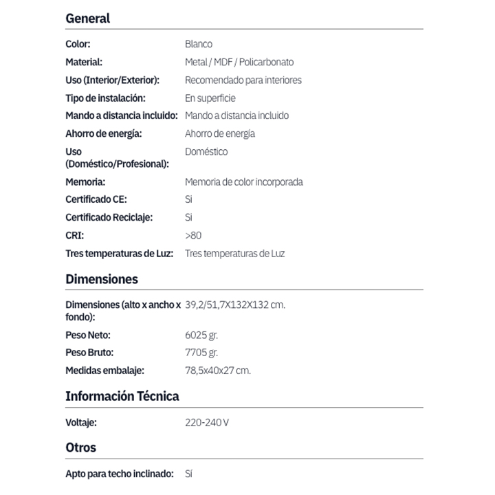Ventilador de techo DC LIVORNO blanco 30w 3250lm 132d 4aspas 3000k,4500k,6000k, control remoto, temporizador, memoria. Ventilador DC de la serie LIVORNO realizado en metal, MDF y policarbonato, en color blanco con cuatro aspas. Tiene seis velocidades ajustables con motor DC. Tecnología LED incorporada con una potencia de 30W, con 3 temperaturas seleccionables de luz( 3000-4500-6000K) y 3250 lúmenes. Su diseño moderno pero a la par que elegante, con aspas aerodinámicas de gran tamaño, lo hacen ideal para salones, comedores, espacios abiertos y zonas de trabajo. Tiene unas dimensiones de 39,2/51,7x132x132 centímetros, incluye dos medidas de tija (12,5 cm y 25 cm), lo que permite adaptarlo a distintas alturas. Control de aire verano o invierno. Mando a distancia incluido, memoria de color incorporada y temporizador 1/2/4/8 H. REF: 208191401